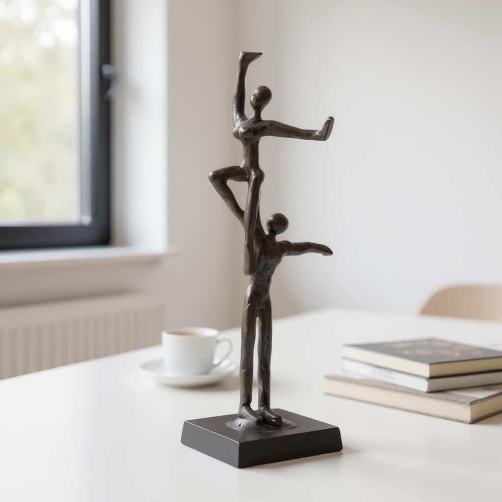 Elegant and artistic black metal sculpture featuring a dancing couple design on a wooden platform, adding a touch of grace and beauty to any space. The distinct black finish on the metal and wood allows this art piece to enhance the sculpture’s contemporary appeal and complements any color palette in your home or office decor.