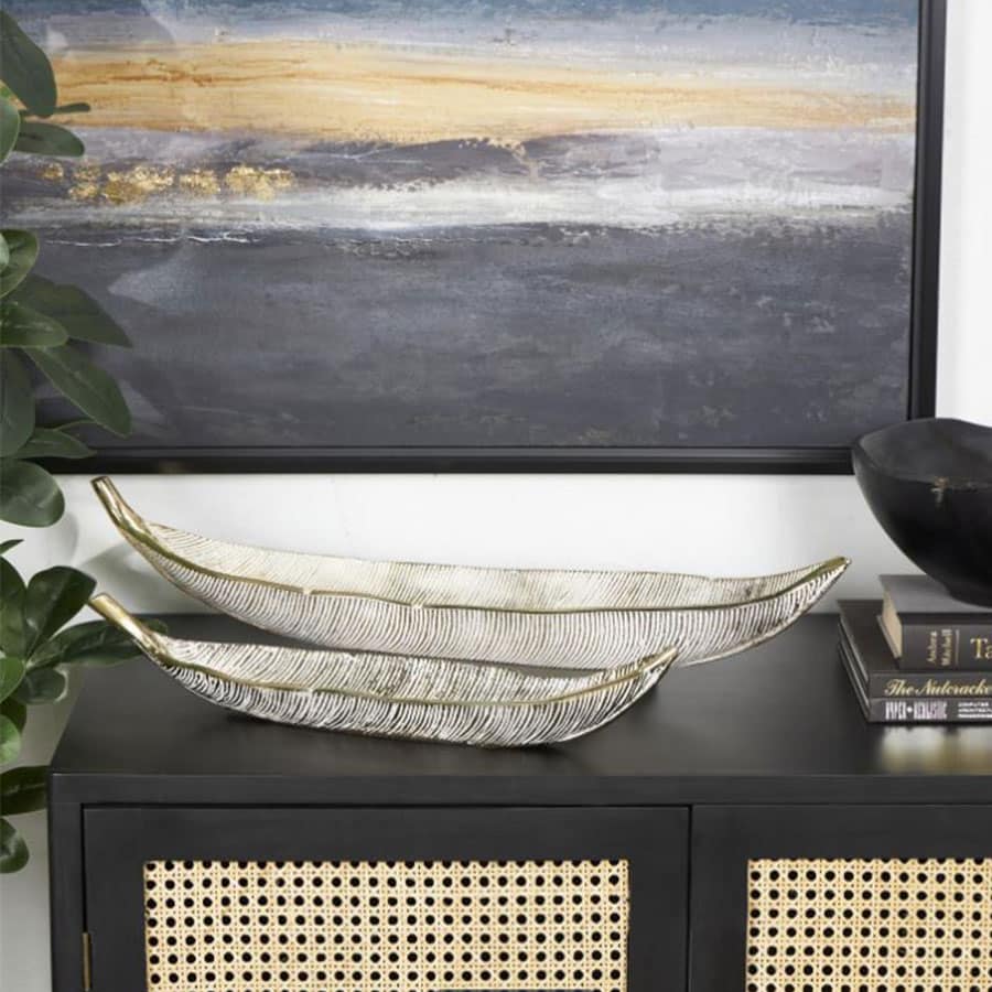 The leaf slim carved decorative bowl set features a silver finish that exudes contemporary sophistication.