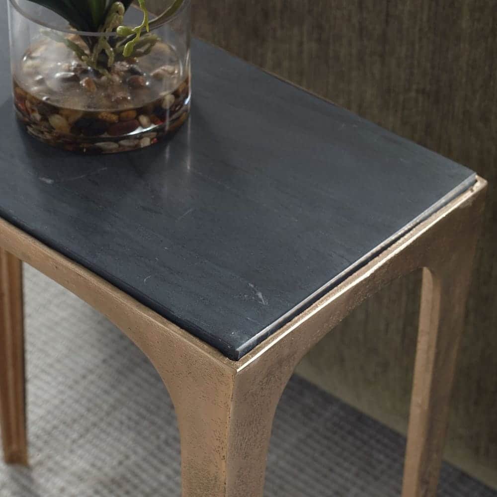 Crafted from cast aluminum and finished in a warm antique brass, this frame features soft, rounded curves that lend a graceful, organic feel to the design. Topped with black marine marble, the table balances bold contrast with refined simplicity. Due to the natural characteristics of marble, each piece will be unique.