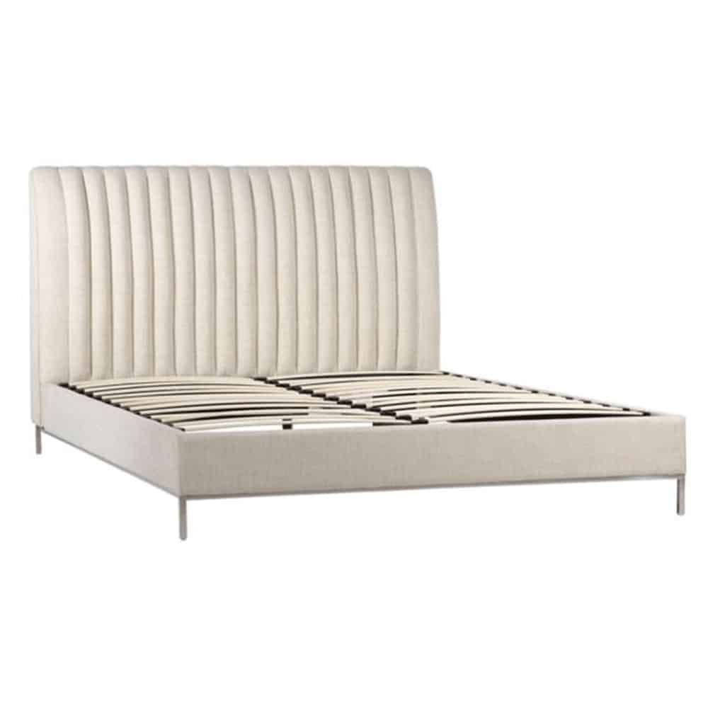 This classic upholstered bed has just what it takes to tie your bedroom together. Featuring an airy, poly blend upholstery with a buttonless tufted headboard in a light oatmeal color and finished with a chrome base. This bed offers brilliant style and soft textures that make it the perfect addition to your bedroom.
