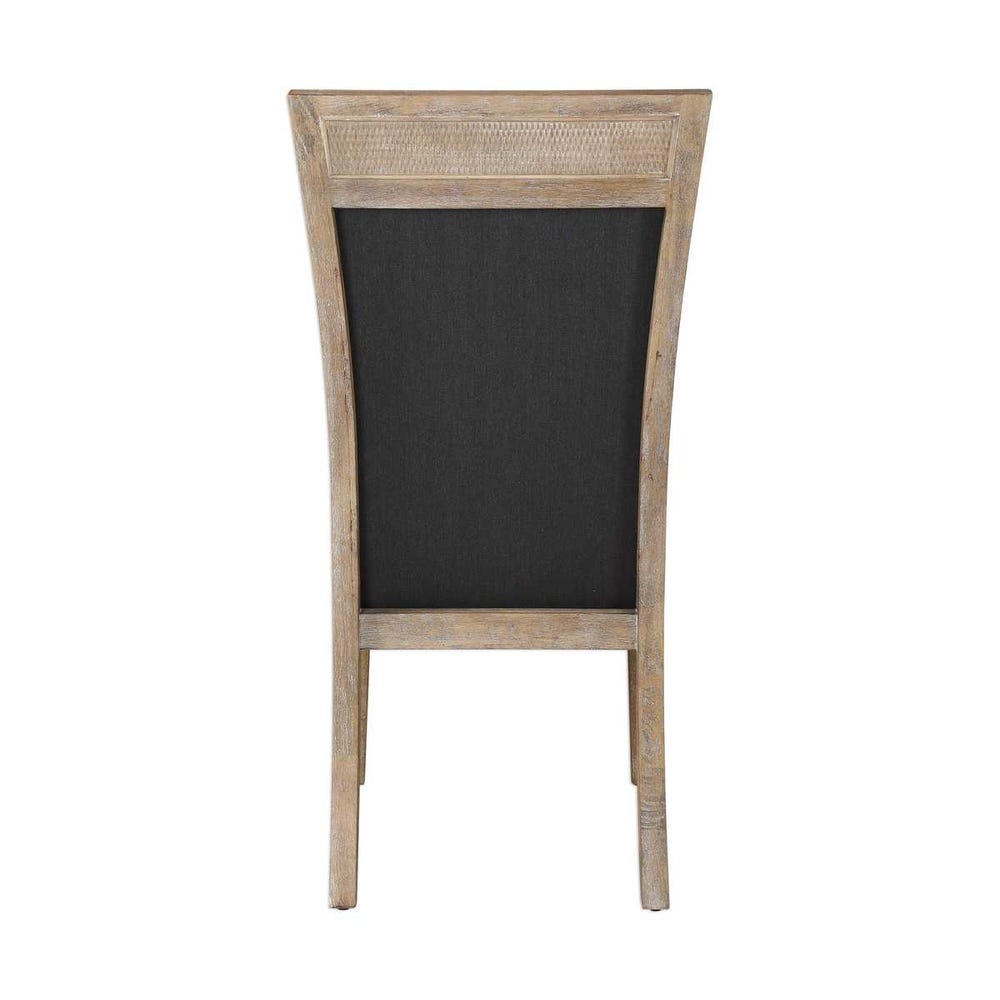 Make a dramatic style statement with this supportive high back chair, featuring a cane accented top in a hand rubbed sandstone exposed hardwood finish, tailored in a durable yet lush dark gray fabric.