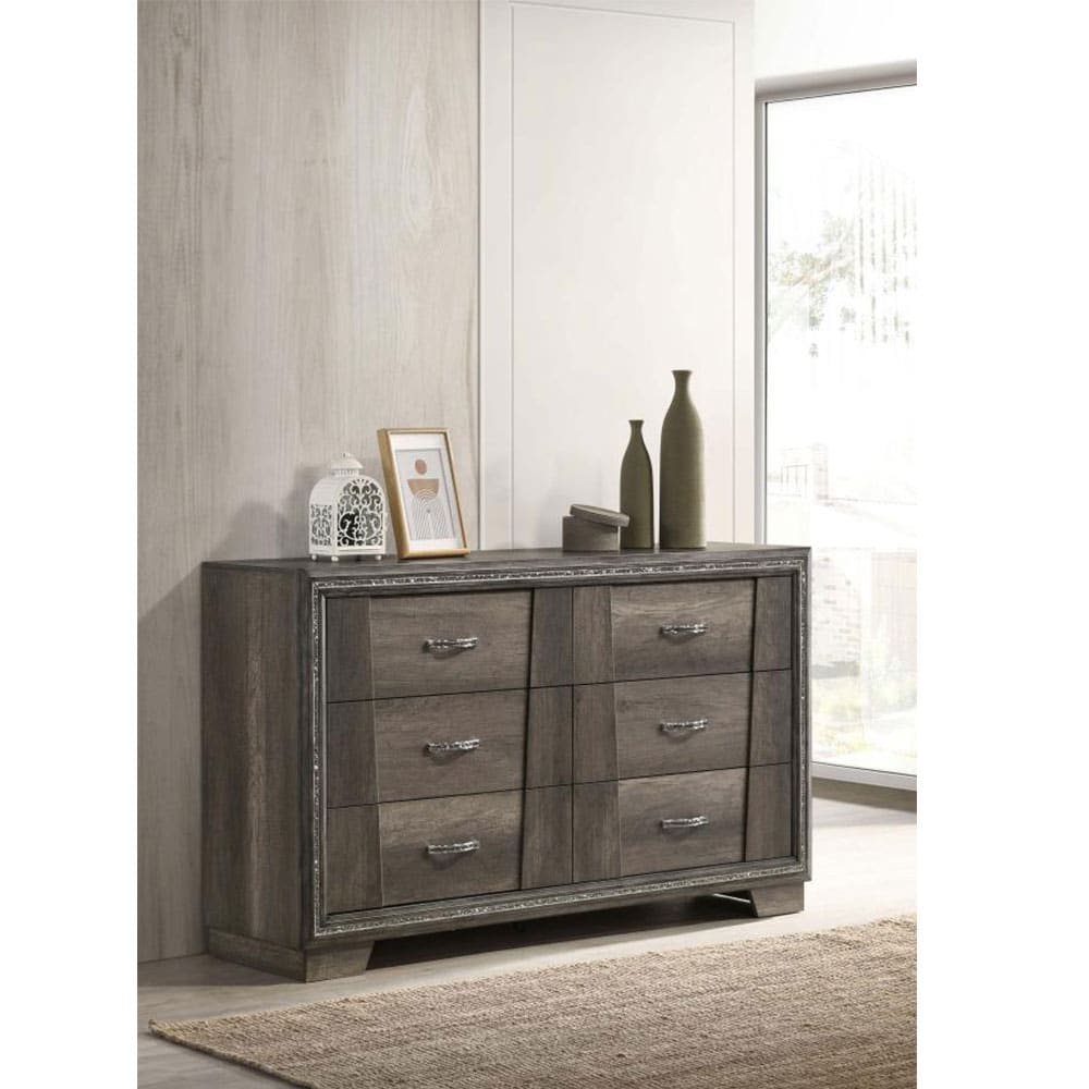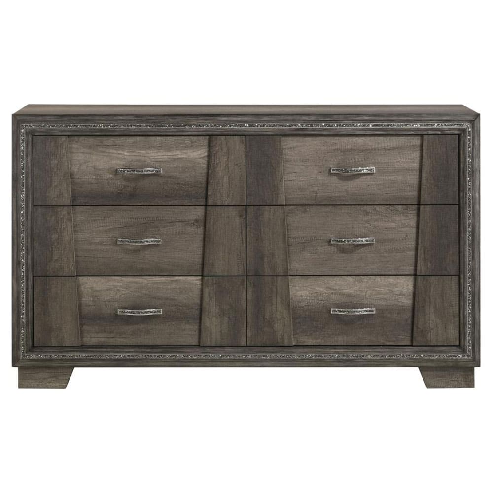 Elevate your bedroom with our 6-drawer dresser that embodies modern glamour. The glittering strips and shimmering pulls create a captivating aesthetic. Its subtle V-shaped design adds a touch of sophistication. The black felt-lined top drawers offer both practicality and protection for your valuables. Experience the perfect blend of style and functionality with this exquisite dresser, enhancing the allure of your living space.