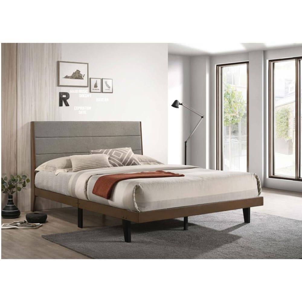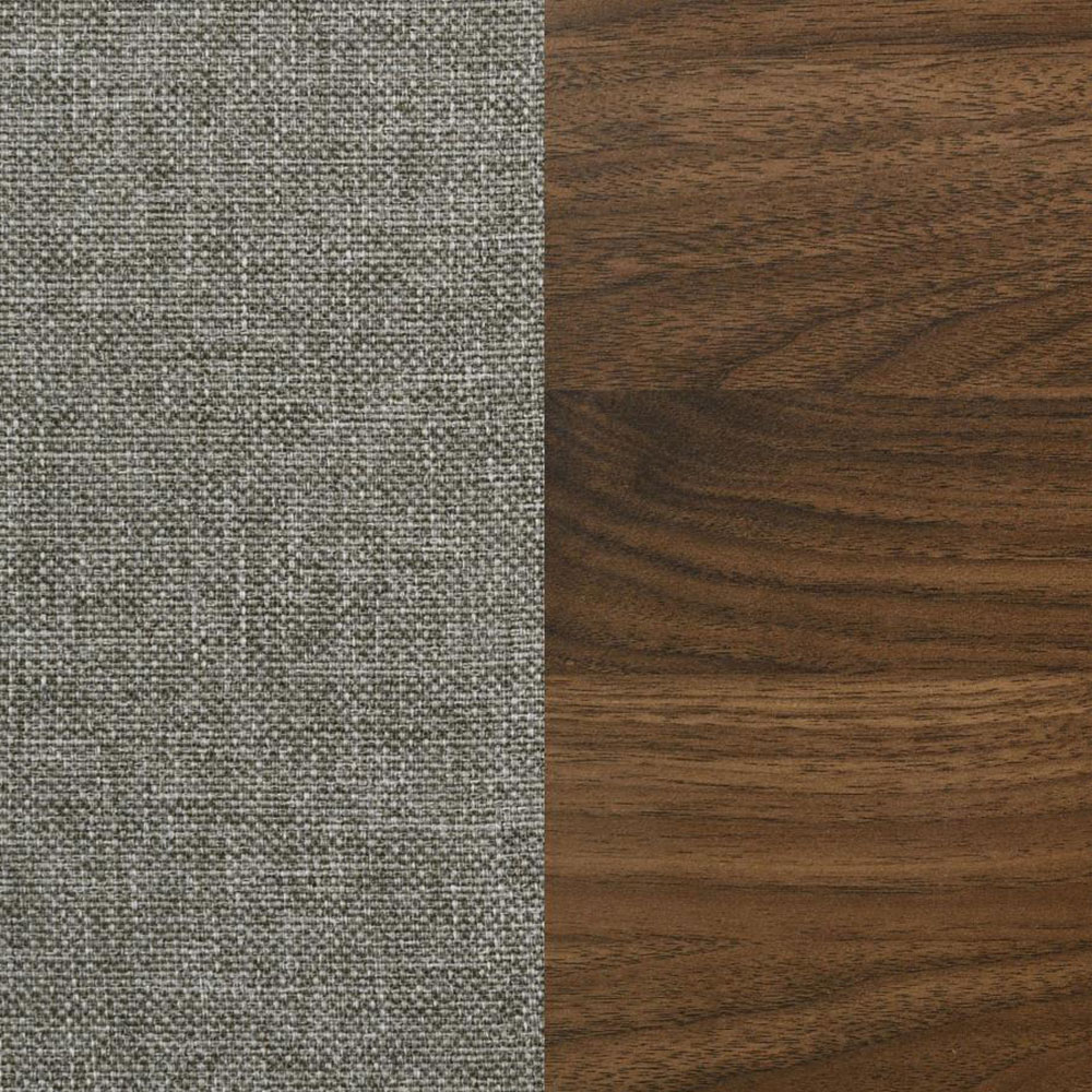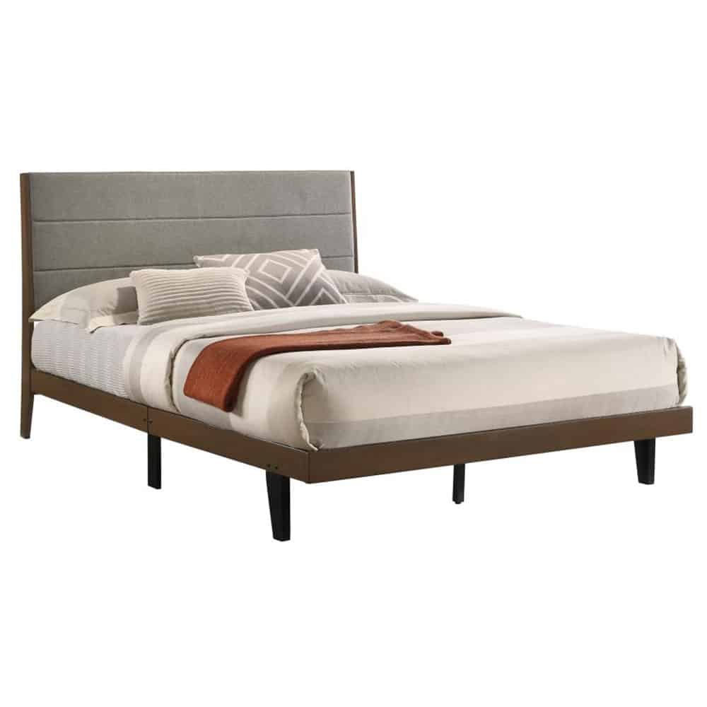 This elegant, modern, platform bed is designed with a grey channel tufted headboard for a soft resting place. A walnut finished frame rests on angled black legs, providing elevation and a neutral earthy hue that works with countless color palettes.