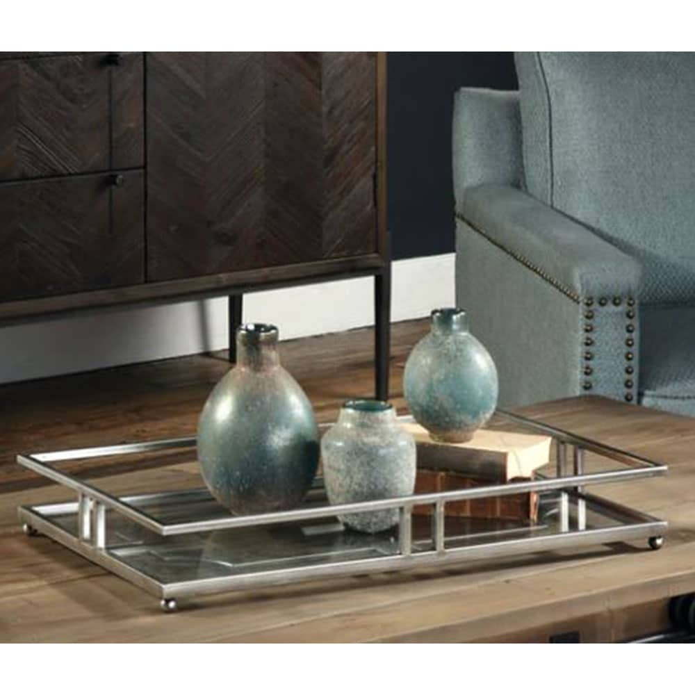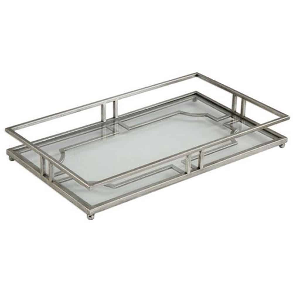 Forged iron with a metallic silver leaf finish accented by a reinforced glass interior.