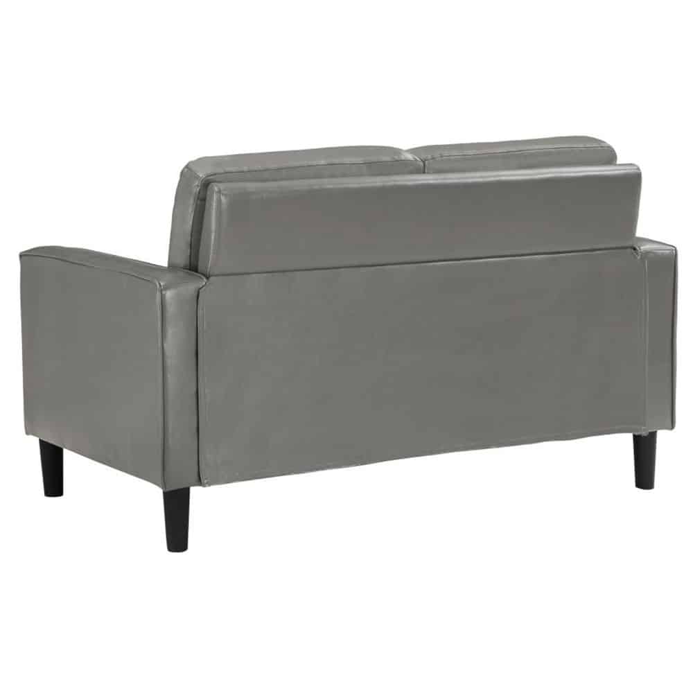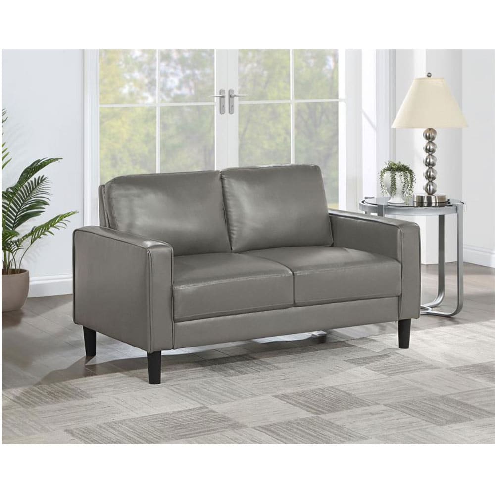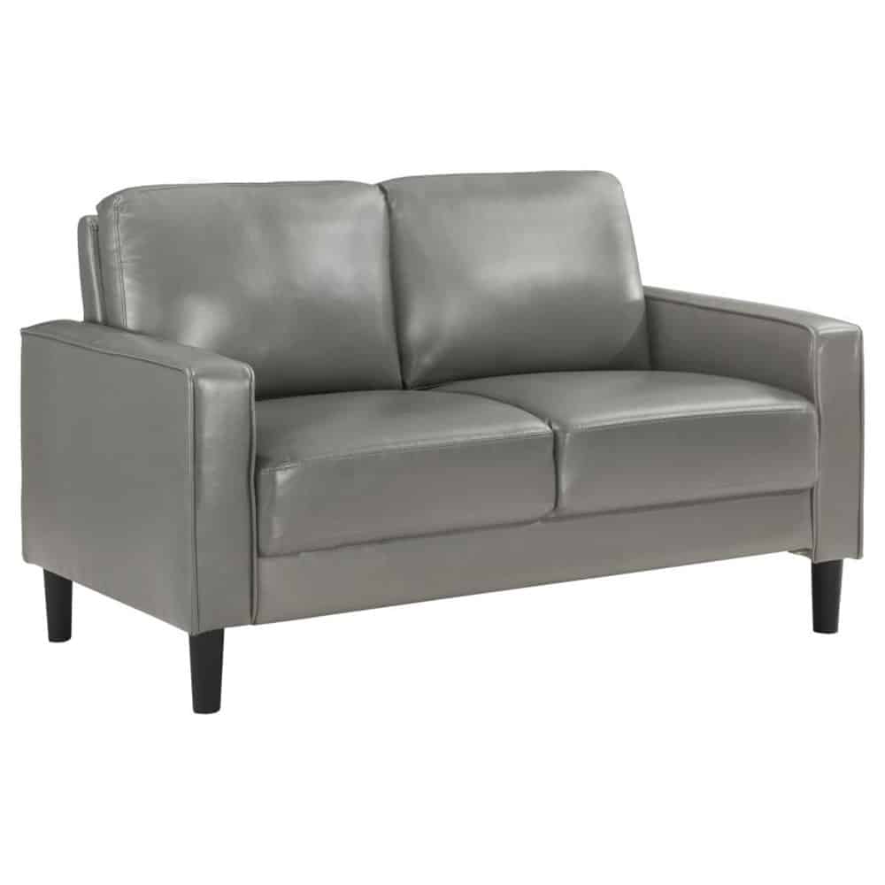 A compact profile makes this modern loveseat the perfect choice to add seating in a living room or den. It’s a structured silhouette complete with track arms. Faux leather upholstery is supple and smooth, offering contemporary style and sophistication that impresses without overwhelming. Plush cushions provide wonderful comfort for lounging, with sinuous spring decking under seats and a webbed back. Tapered, straight legs offer a chic finishing touch, providing support and stability.