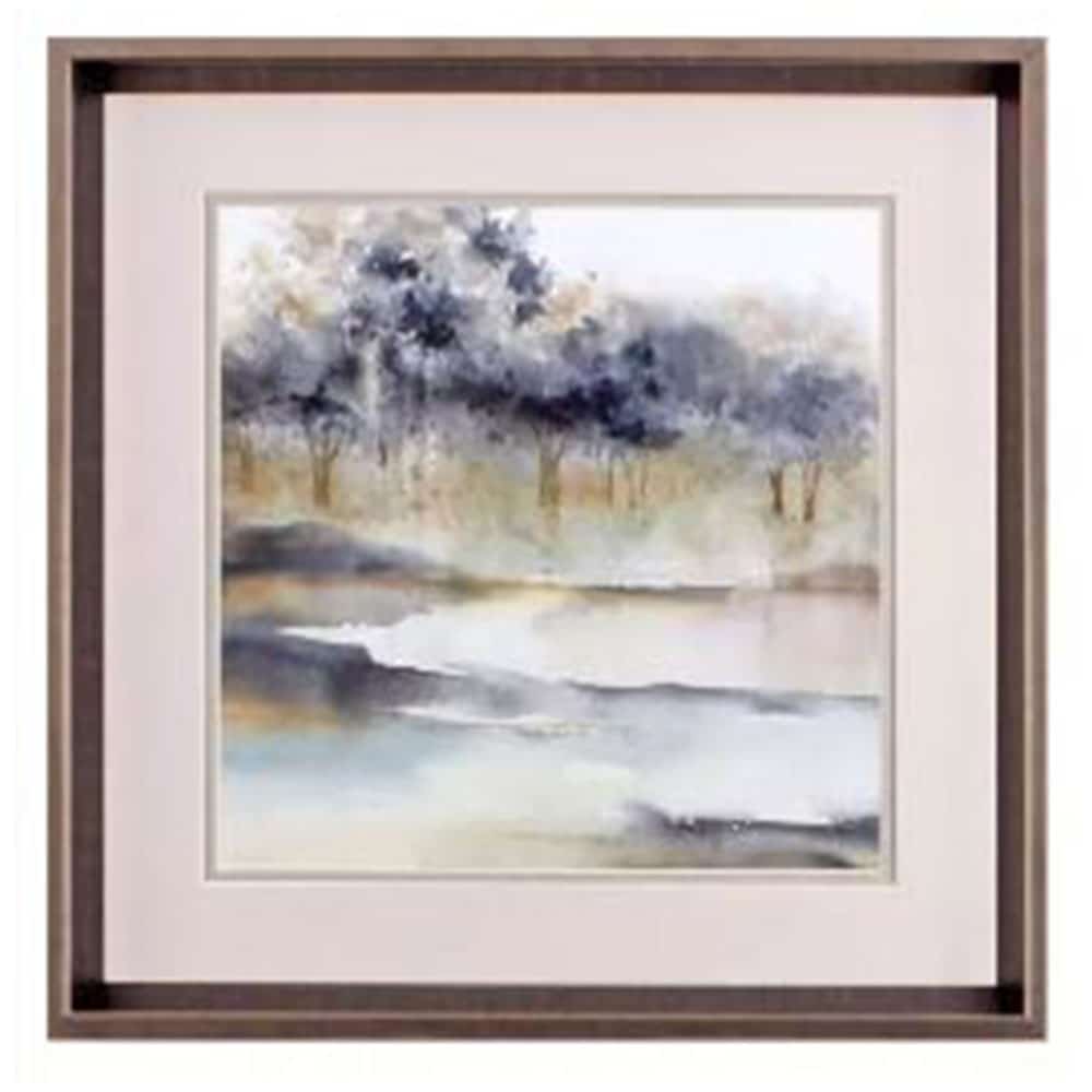 Landscape print that is double matted and framed under glass with a metallic bronze frame.