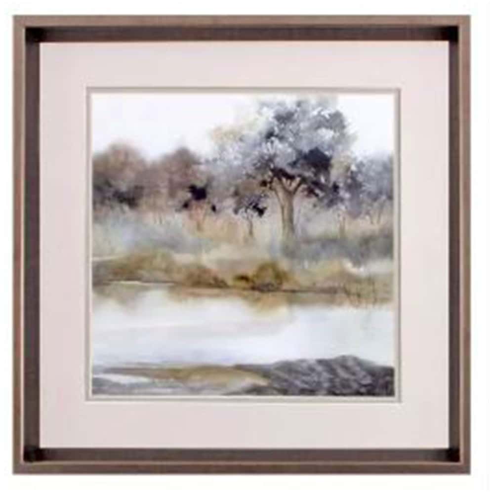 Landscape print that is double matted and framed under glass with a metallic bronze frame.